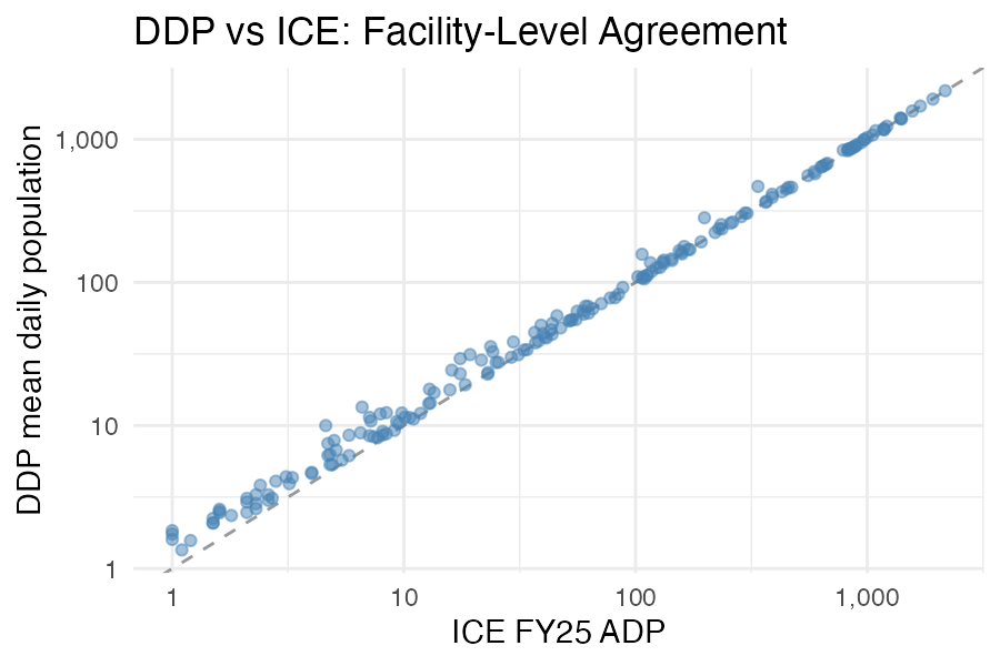 Comparing the Deportation Data Project’s daily detention counts with ICE’s published annual statistics to identify unreported facilities and track population changes