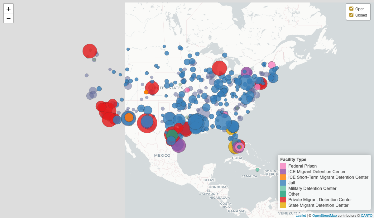 An interactive map of 401 ICE detention facilities (FY2010–FY2026), colored by facility type and sized by average daily population