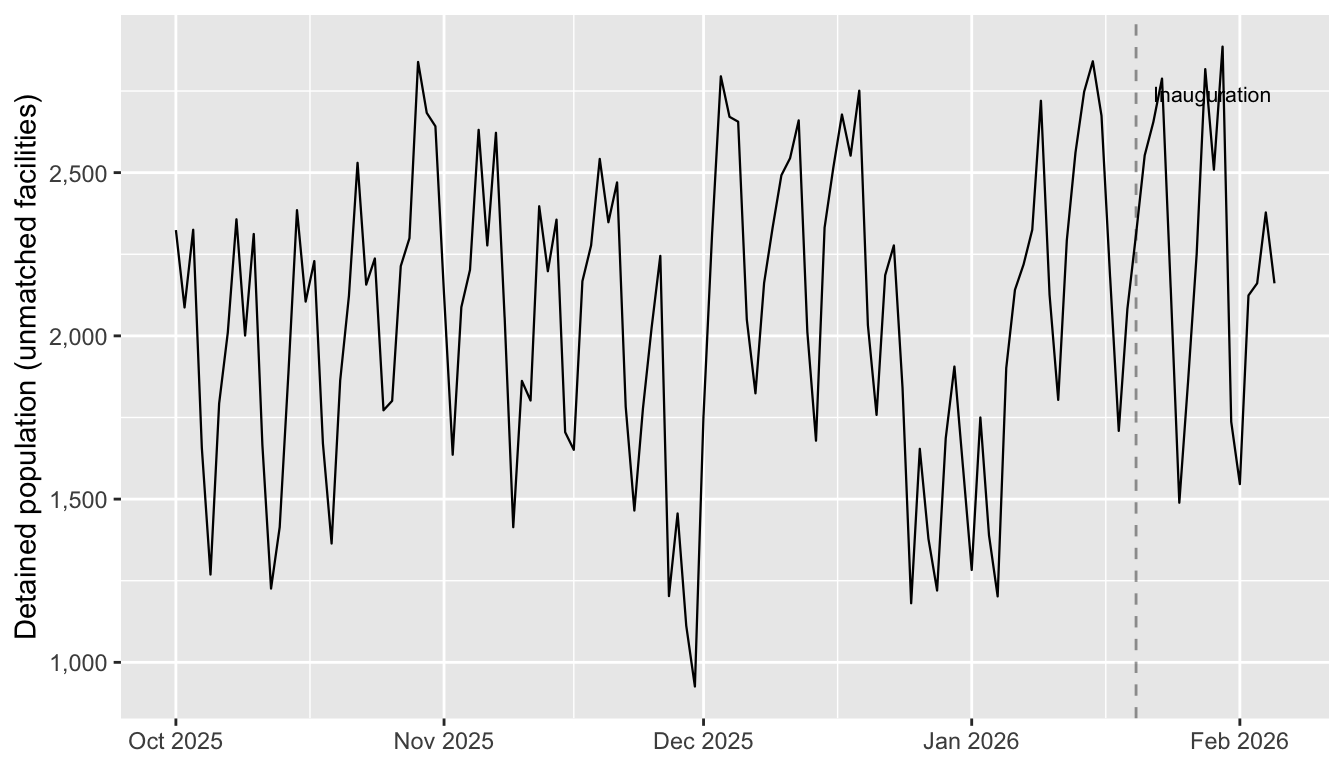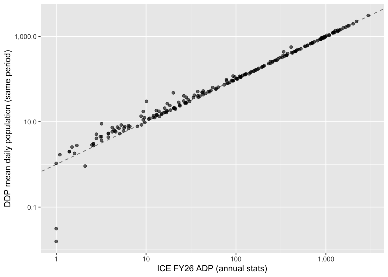 Significantly, both of these are government-generated datasets, provided more and less willingly (respectively) by Immigration and Customs Enforcement. Where doing comparisons below, we focus on the October 1, 2025 – February 12, 2026 period covered by the ICE FY 2026 spreadsheet. Where summarizing detention as a whole, and in drawing the sparkline graphs for each facility on the map, we go as far as the DDP allows.
