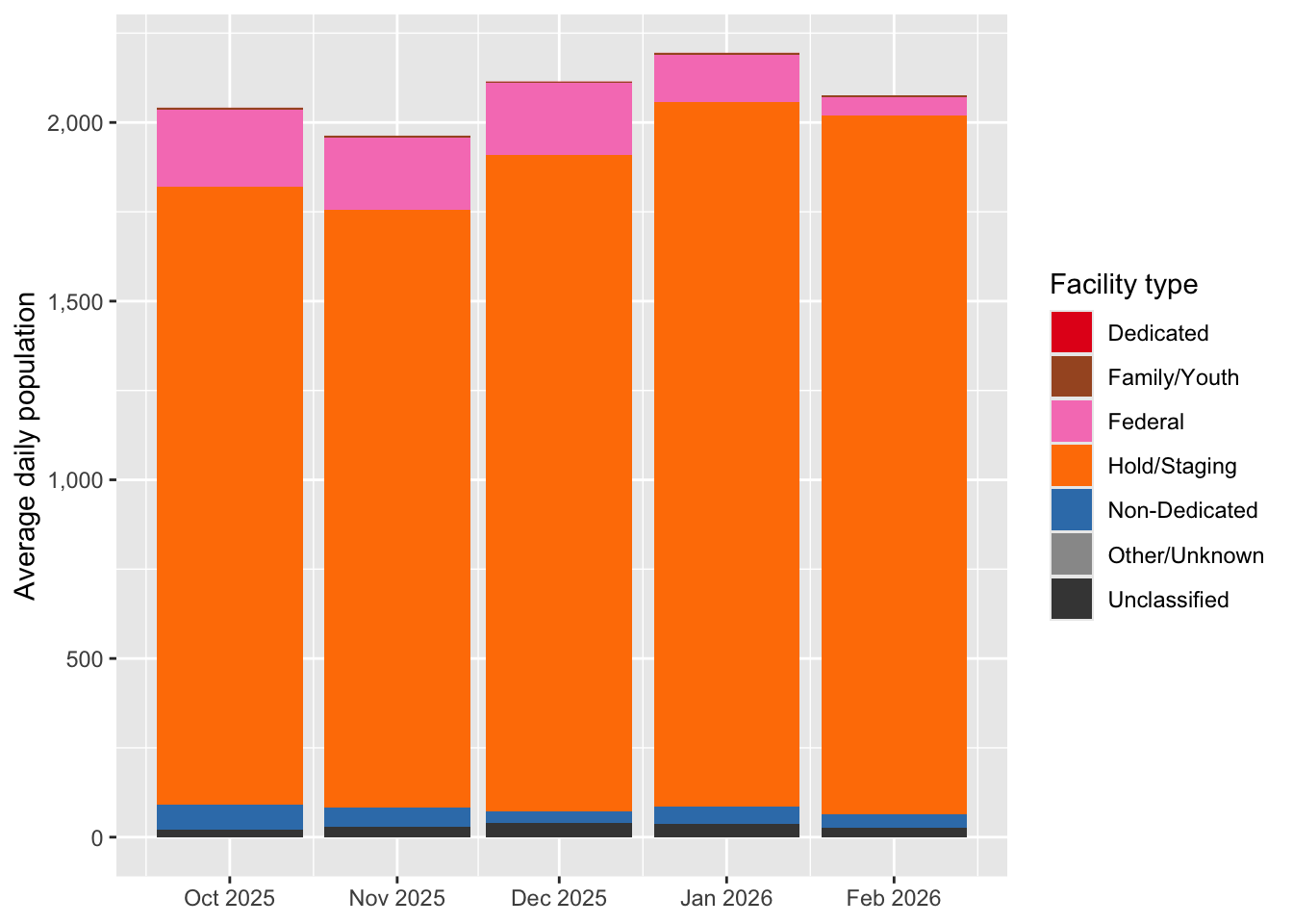 In FY 2026, it is Hold Rooms and other Staging facilities that account for the vast majority of the unreported population. For comparison, hold facilties in FY 2025 had an average daily population of about 1,163 detainees, with an average of 1,986 in the final 60 days.