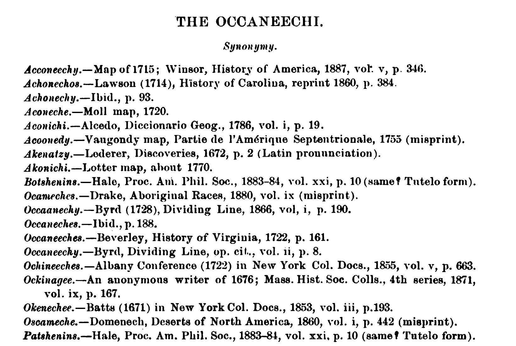 Here are three sample uses of the create_multiple_redirects_to_one function. The last two are practical uses, coming from the corresponding pages: Hickory Ground and Occaneechi people. The latter ultimately comes from the name lists (or synonymy) generated by James Mooney as shown in the margin.