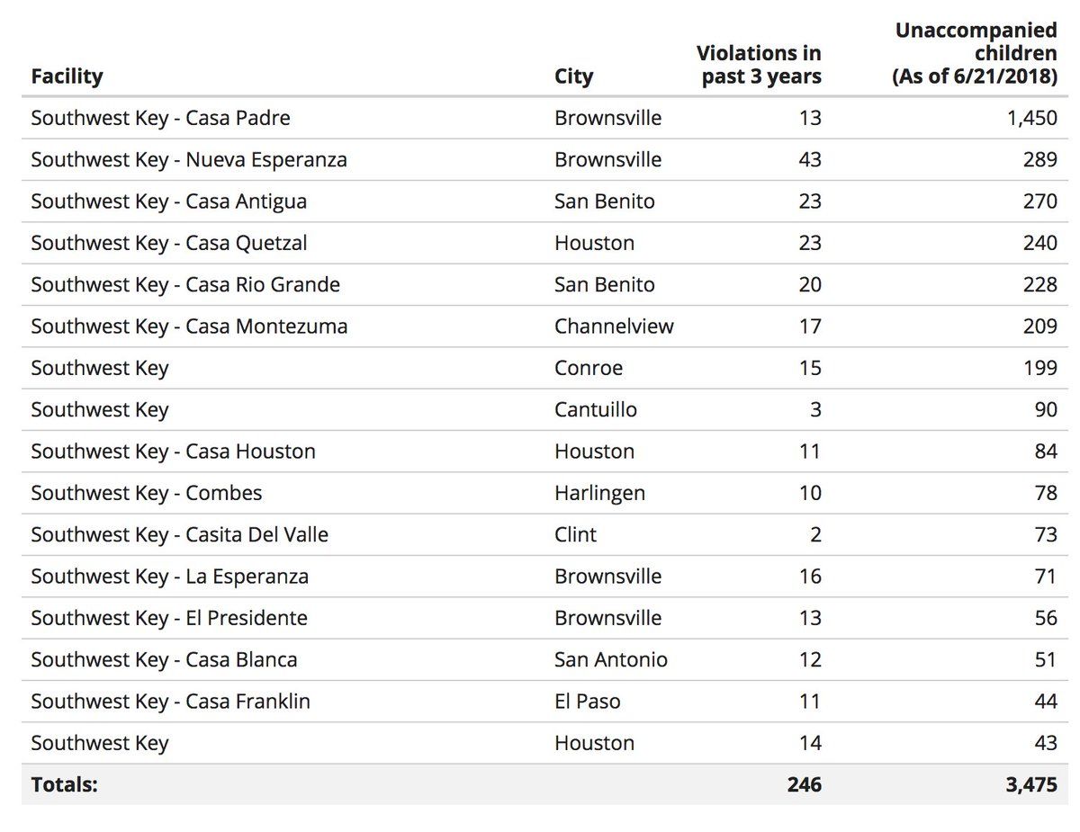 A breakdown of the 31 facilities holding migrant children in Texas, their owners, and their record of standards violations and abuses. (Two-thirds are held by