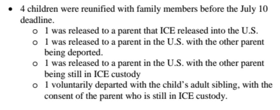 Federal court filing detailing the status of immigrants 4 and under separated from their families as of July 10: