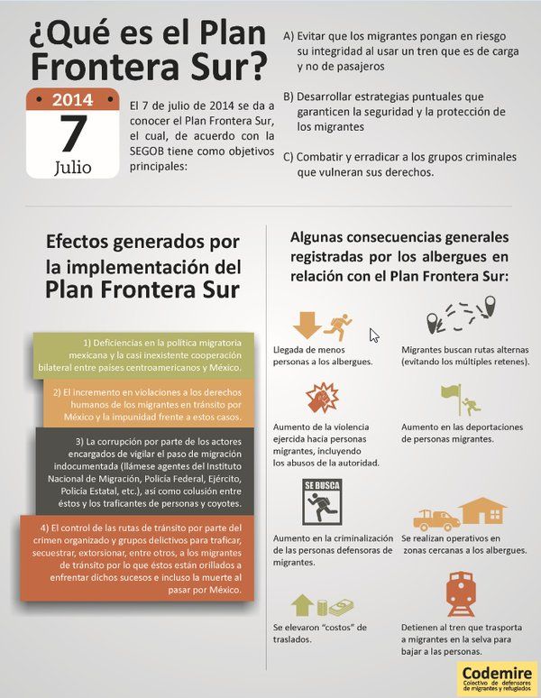 Since 2014, the Mexican government has implemented Plan Frontera Sur ("Southern Border"), a system of discouragement to migration subcontracted by the USA.