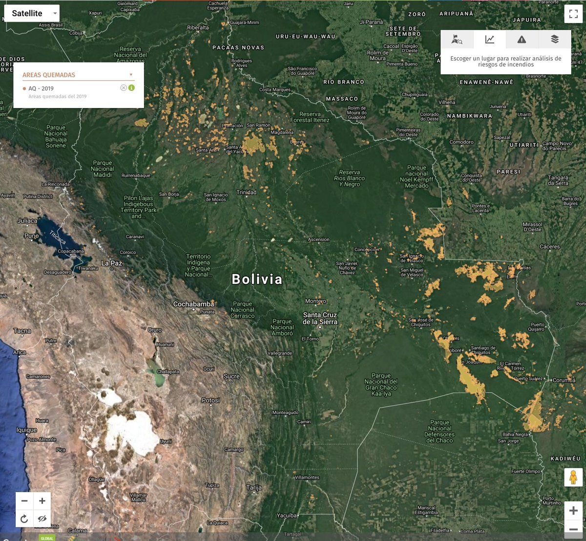 The burned area (thru last Tuesday, August 27) was caculated at 2.1 million hectares by Fundación Amigos de la Naturaleza based on satellite data. incendios.fan-bo.org/Satrifo/mapa-interactivo/# #BoliviaFires