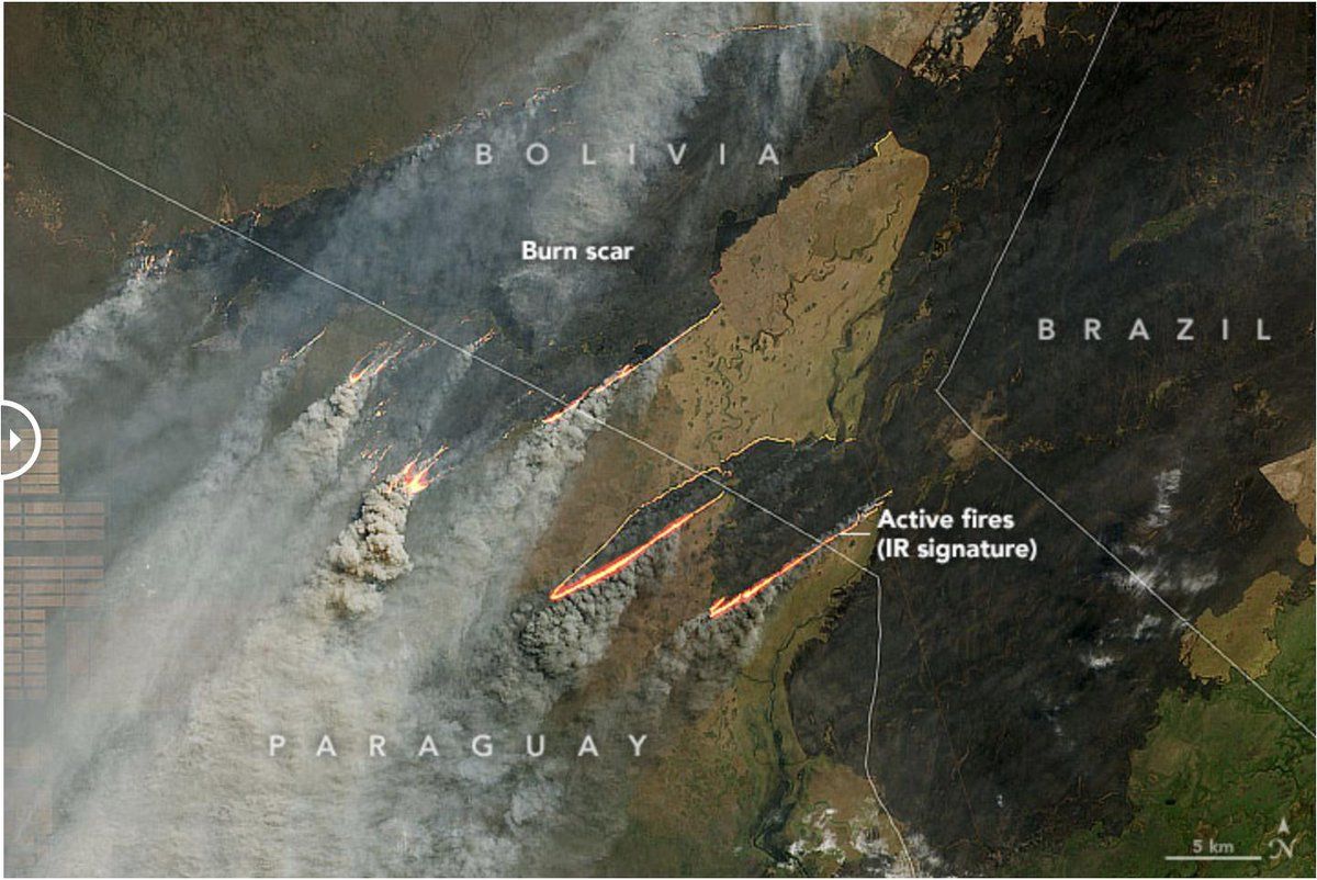 NASA imagery (w/ false color for infrared fire signature) of fires in the far southeast corner of Bolivia, that spread from Paraguay, as of 26 August 2019. earthobservatory.nasa.gov/images/145522/fire-burns-in-paraguay-bolivia-and-brazil high-res: eoimages.gsfc.nasa.gov/images/imagerecords/145000/145522/bolivia_oli_2019237_swir_lrg.jpg