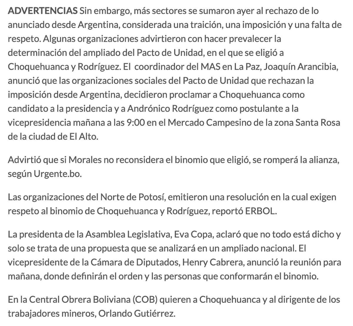 #EleccionesBo2020 A rundown of the dissenting forces within the MAS-IPSP / Unity Pact / Central Obrera Boliviana coalition who are backing Choquehuanca… opinion.com.bo/articulo/pais/morales-ratifica-binomio-analizan-romper-alianza/20200121233402747140.html