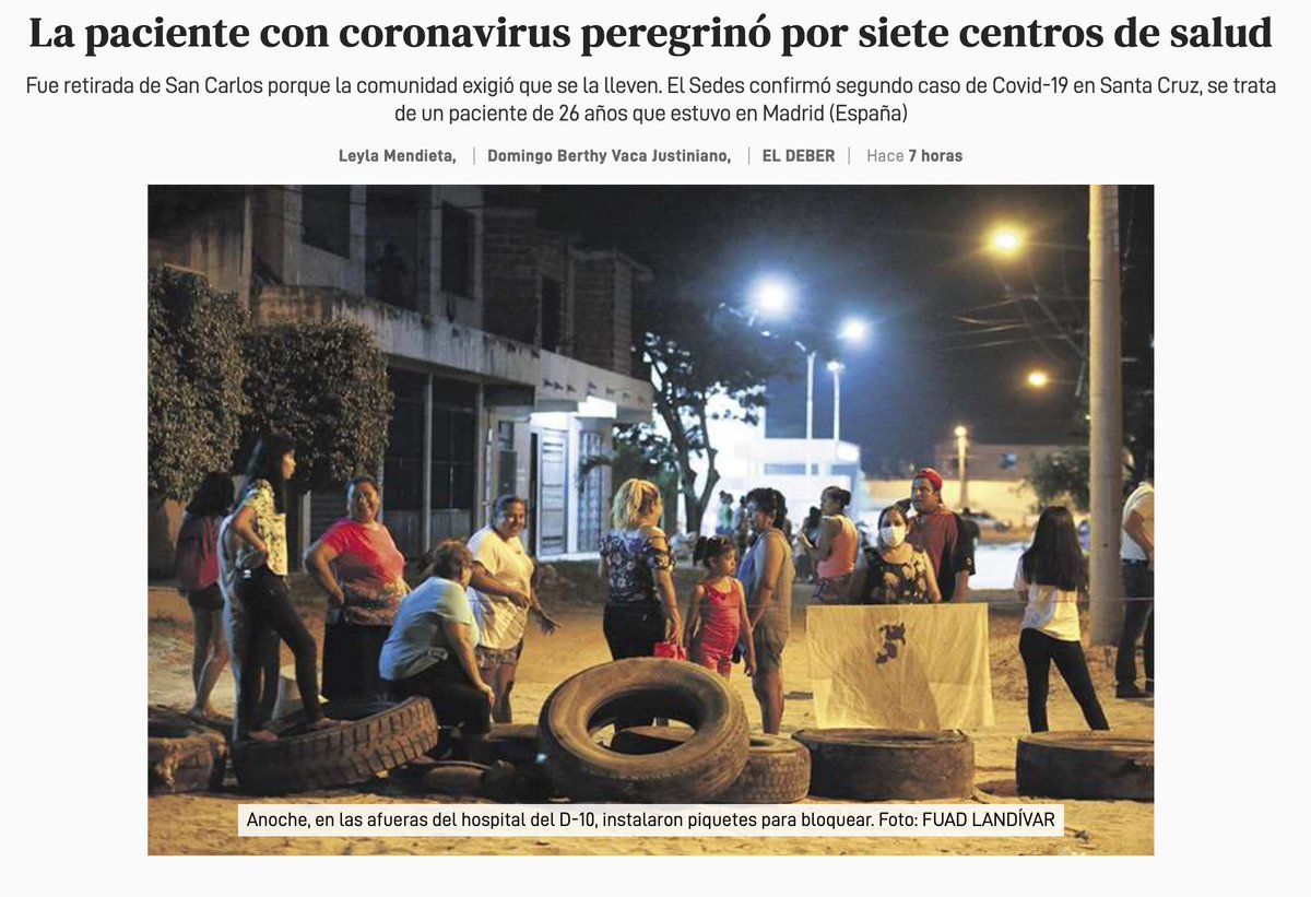 More detail on the shameful nightmare of Santa Cruz doctors refusing en masse to treat a patient with Corona virus. Health personnel mobilized to deny her entry in the San Juan de Dios, Japonés, El Bajío, Francés and Fortaleza hospitals. eldeber.com.bo/169205_la-paciente-con-coronavirus-peregrino-por-siete-centros-de-salud