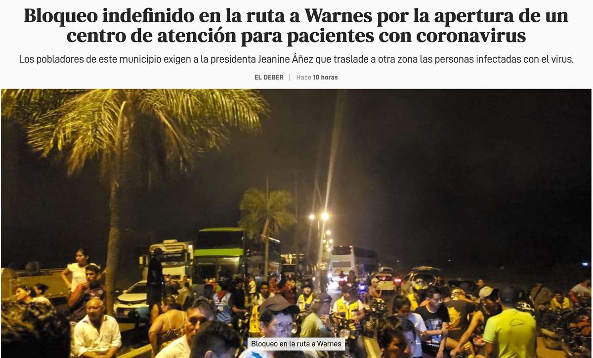 This immediately touched off a new blockade in Warnes, where neighbors have followed the panicked and stigmatizing pattern set by others in Santa Cruz on Wednesday. eldeber.com.bo/169301_bloqueo-indefinido-en-la-ruta-a-warnes-por-la-apertura-de-un-centro-de-atencion-para-pacientes-con-c