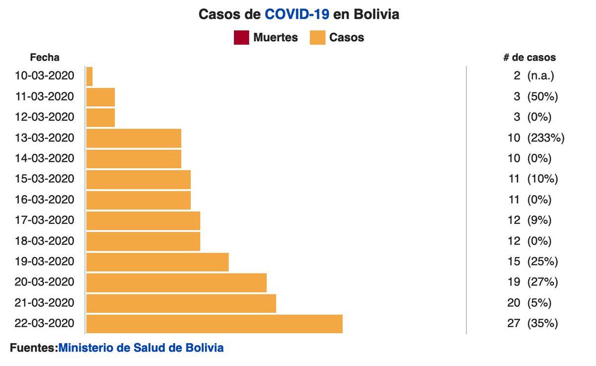 #COVID19Bolivia With 3 new cases tonight, Bolivia reaches 27 confirmed COVID case. Santa Cruz: 1 new travel case, 1 new in-family transmission Cochabamba: 1 from local transmission, with acute bronchitis eldeber.com.bo/170481_coronavirus-dos-casos-mas-en-santa-cruz-suman-15-uno-en-cochabamba-y-la-cifra-sube-a-27-en-el-pais
