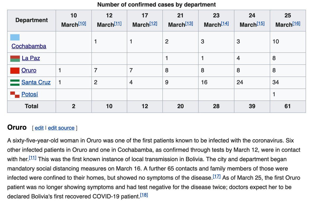 1. #COVID19Bolivia Oruro's first COVID patient has apparently recovered. The department is stable at 8 cases, all of them transmitted from her. The local lockdown apparently worked. @grupoeldeber/1243132008089423873