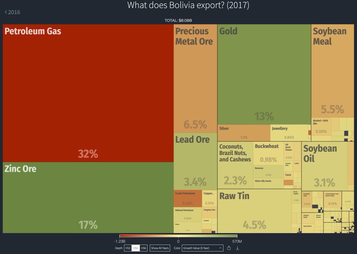 #OilCrash Petroleum gas ("natural gas" for US readers) was about 32% of Bolivia's exports. It's red here for declining value, but remains pivotal to the country's budget. A budget reckoning is coming fast.