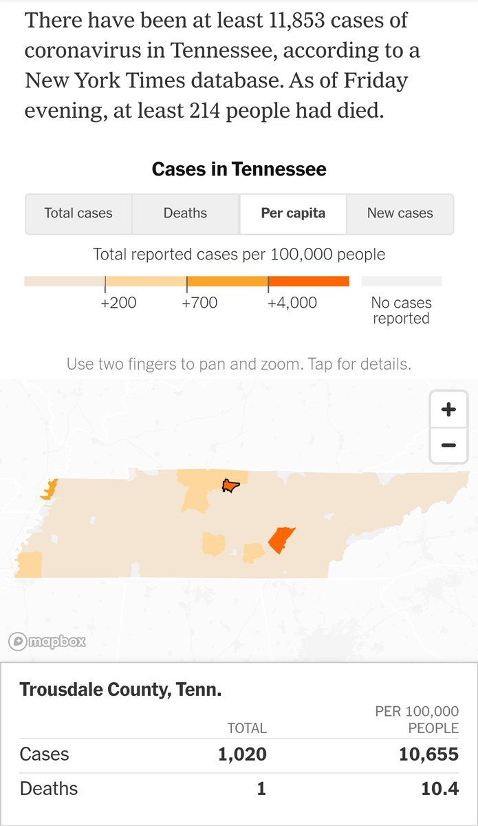 The two COVID hotspots in Tennessee (shown here per capita) are prisons: Bledsoe and Trousdale.