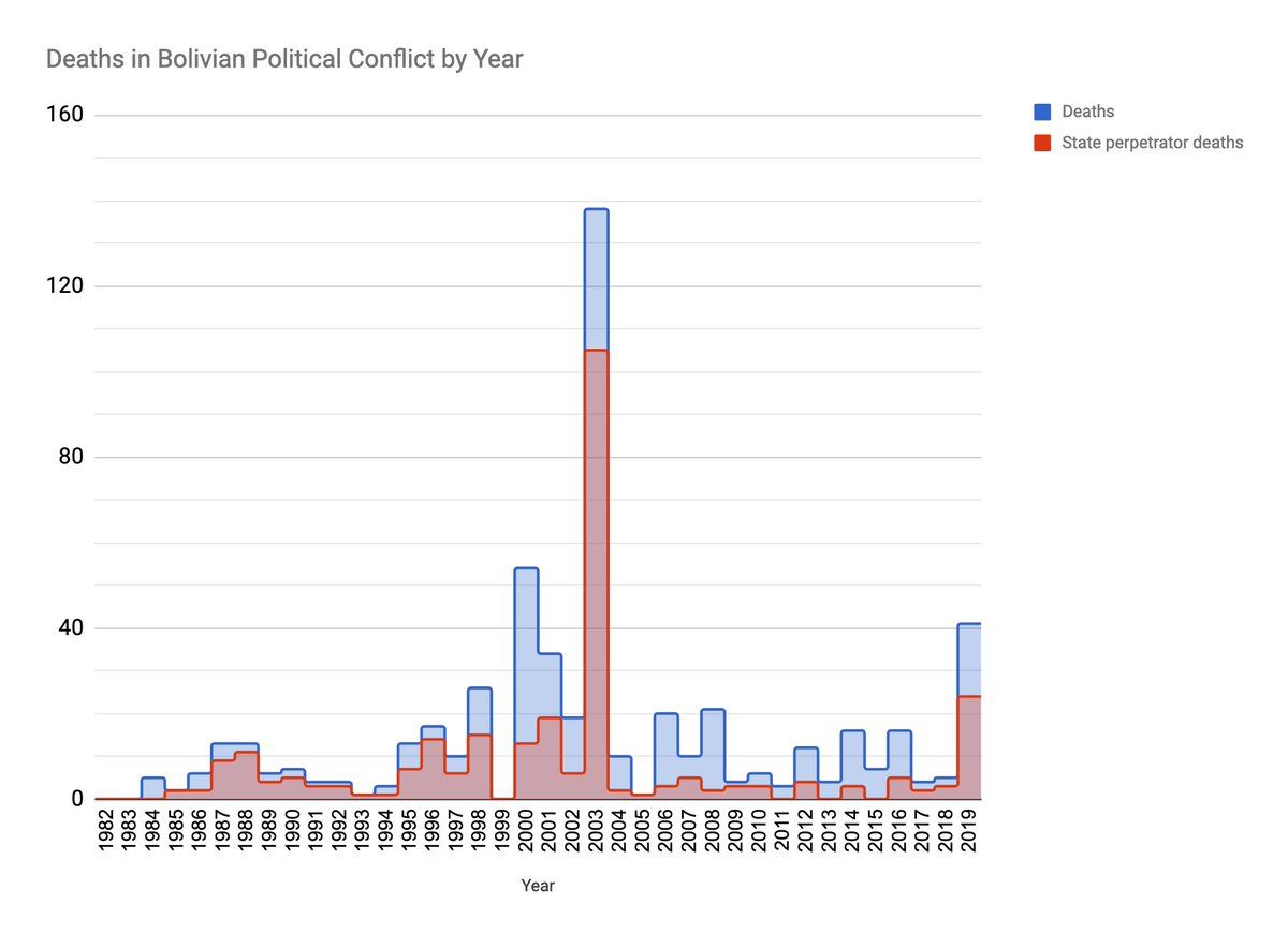 1. Here's what we can learn about deadly political violence during the Evo Morales administration by putting it in context of the 38 years of democracy since 1982: 1. The Morales years were a return to the low levels of state-perpetrated violence that prevailed from 1982 to 1995.