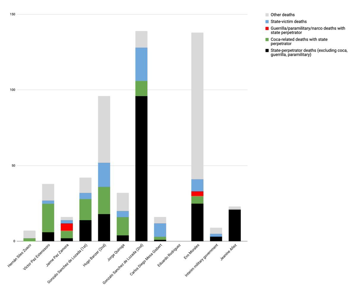 6. If we leave aside the deadly 2000-2003 period (marked by the Gas War, 2003 Tarifazo, and the peak of Laymi-Qaqachaka guerra de ayllus), we see that Morales and Mesa presided over less than half as many state-perpetrated deaths as the pre-2000 era.