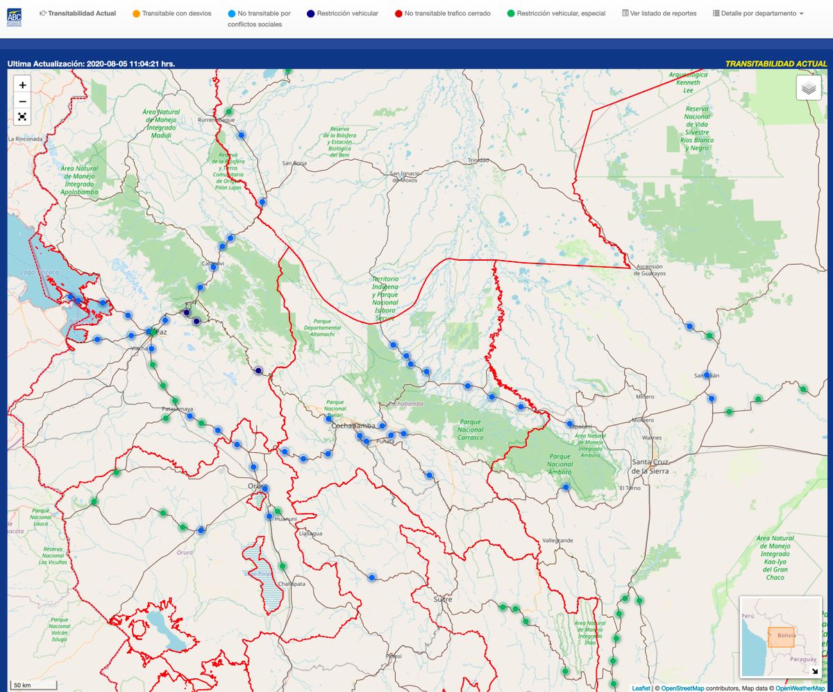 Mapa de transitabilidad por ABC reconoce 45 puntos de bloqueo (en azul). COB y CSUTCB informa que hay más de 75 puntos. la-razon.com/lr-article/mas-de-75-puntos-de-bloqueo-en-seis-departamentos-contra-la-postergacion-de-elecciones/