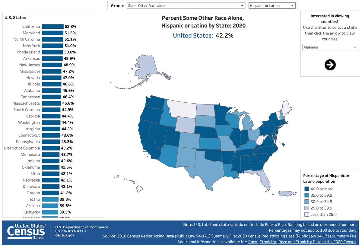 42% of Hispanic/Latinx Americans checked "some other race" or wrote in their ethnicity as their race in the 2020 Census, majorities in CA, MD, NC, NY, RI. #Census2020