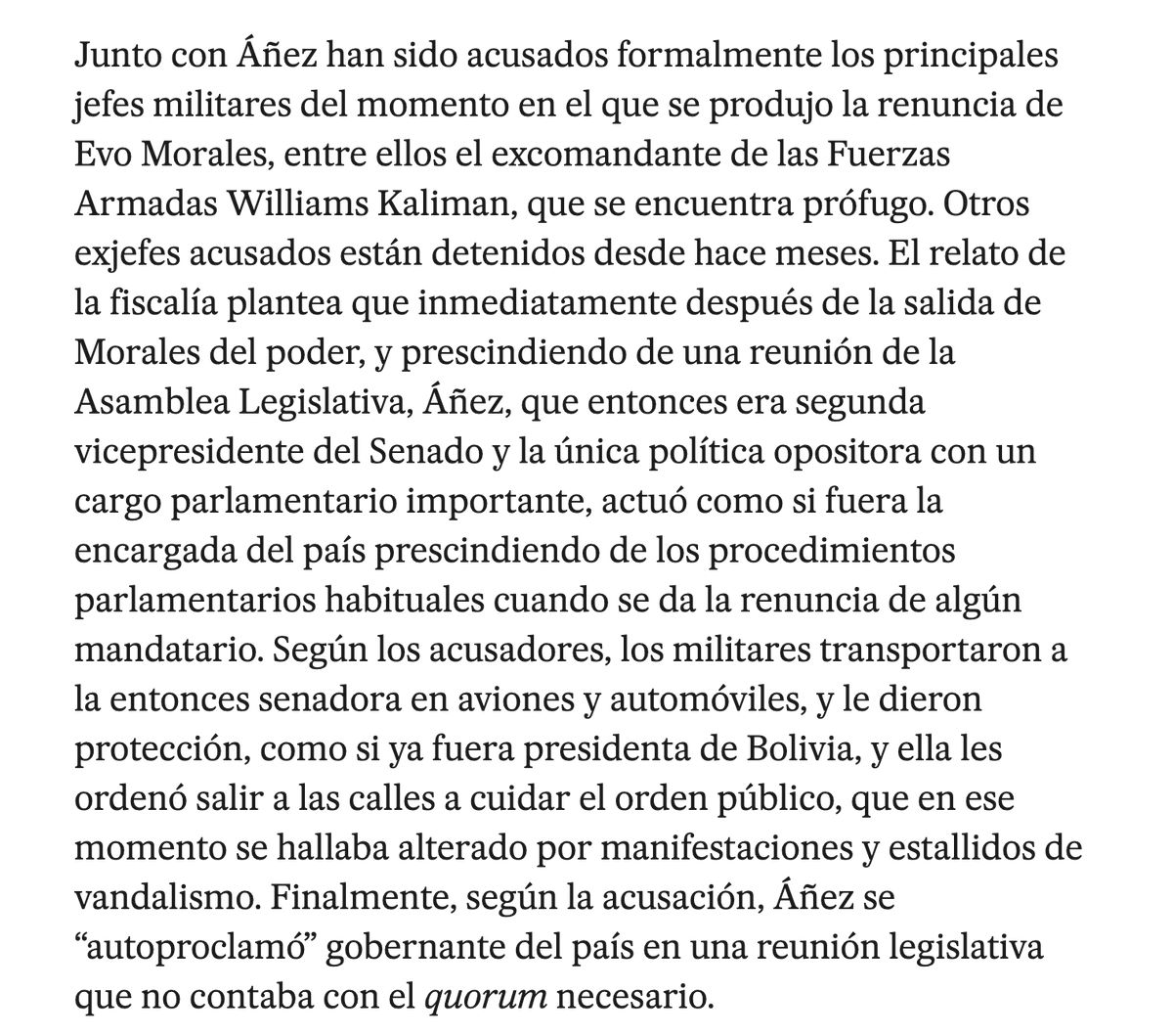 Áñez's most deadly crimes remain presiding over the massacres at Sacaba and Senkata as president. Investigation of those is ongoing.