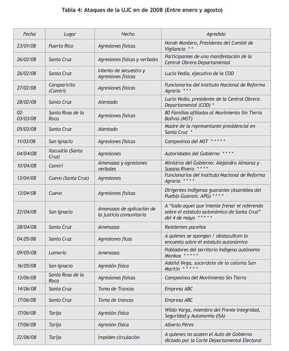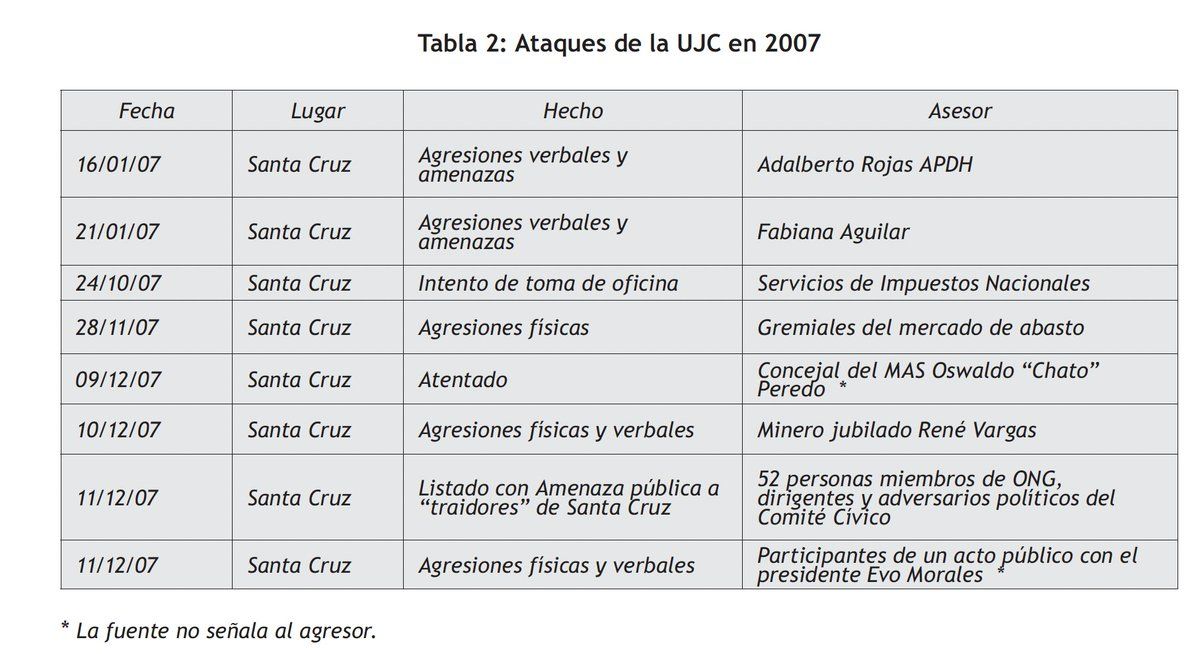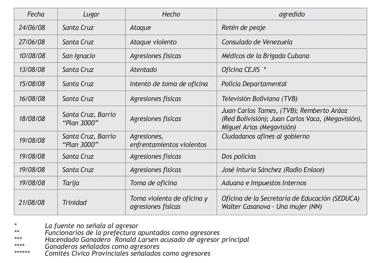 This list appears in Iskenderian Aguilera, Emir. 2010. “Un Periodo Defensivo Para La Burguesía Cruceña: Ataques Confirmados o Atribuidos a La Unión Juvenil Cruceñista, Julio 2006 - Agosto 2008.” Artículo Primero, no. 19 (January): 85–101. cejis.org/bolivia-2008-el-conflicto-de-septiembre/2/