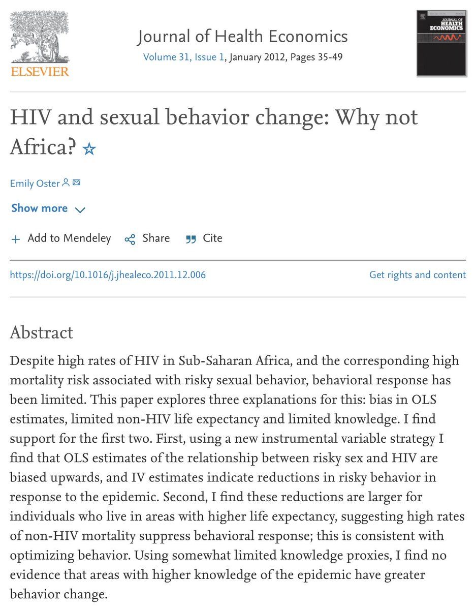 @n_hold @Ethnography911 @GYamey Also interesting: Oster, Emily. “HIV and Sexual Behavior Change: Why Not Africa?” Journal of Health Economics 31, no. 1 (January 1, 2012): 35–49. doi.org/10.1016/j.jhealeco.2011.12.006.