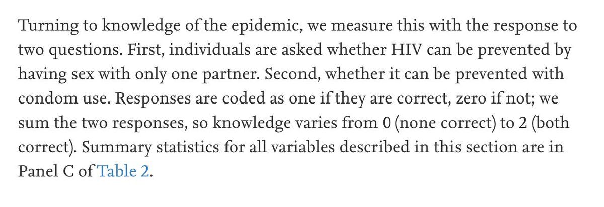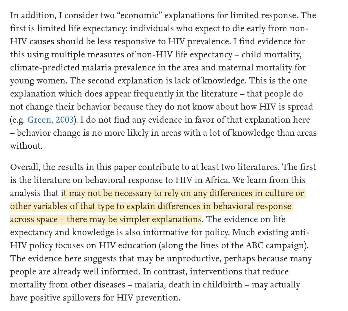 @n_hold @Ethnography911 @GYamey In which Oster attempts to answer the question, why do Africans not change their sexual behavior when they get a positive HIV test? And concludes that it's a (neoclassical) economic response to shorter lifespans.