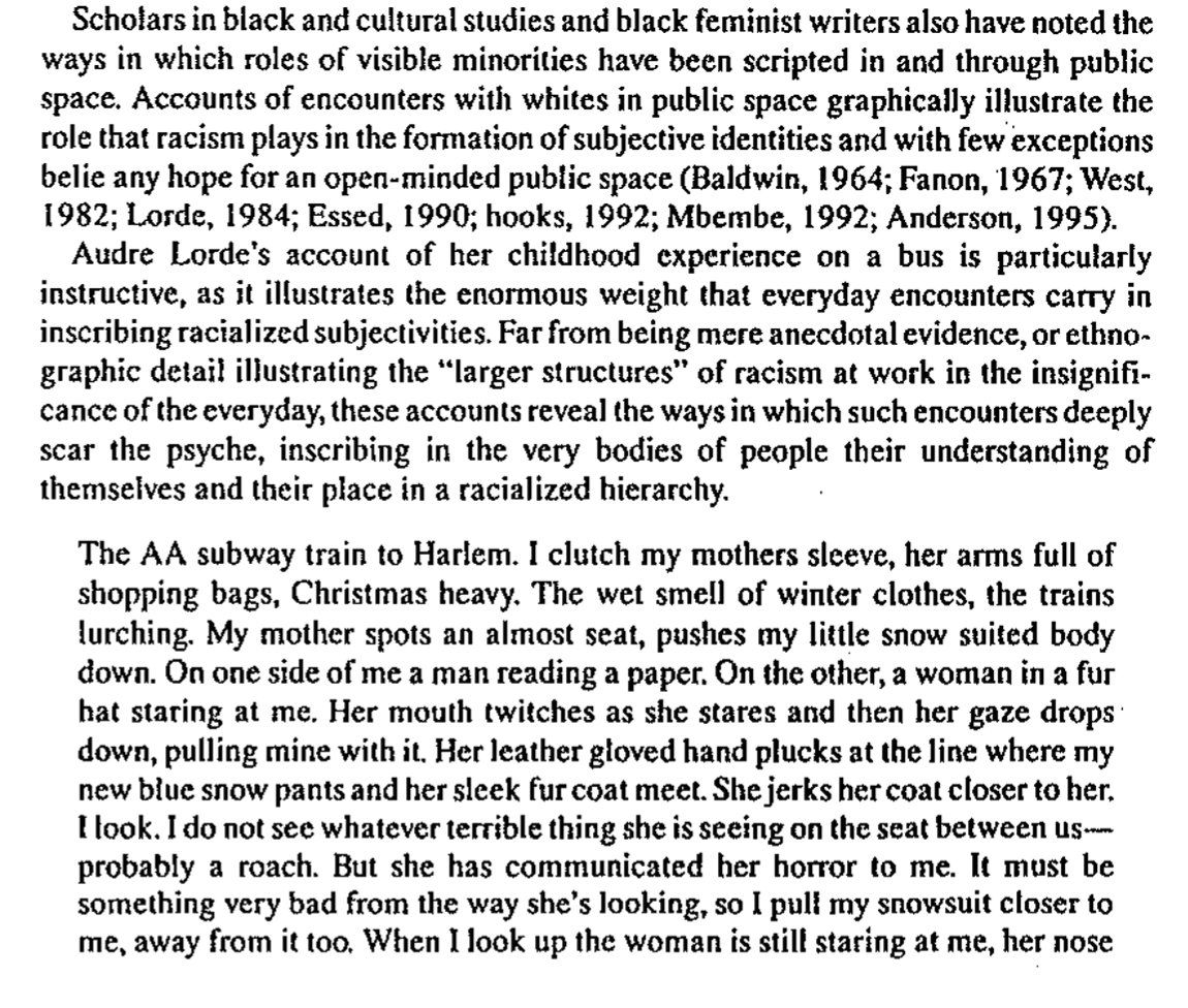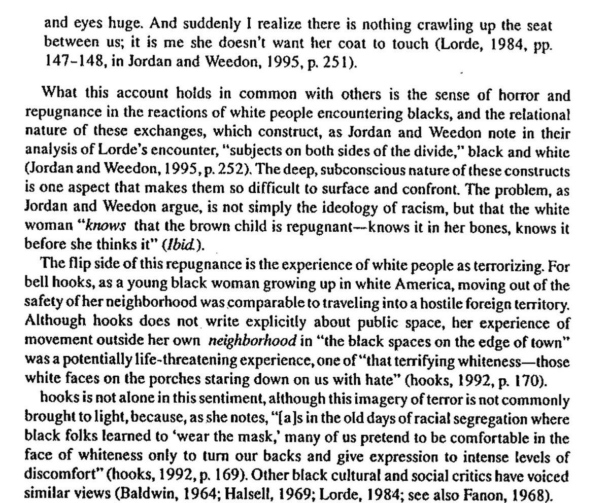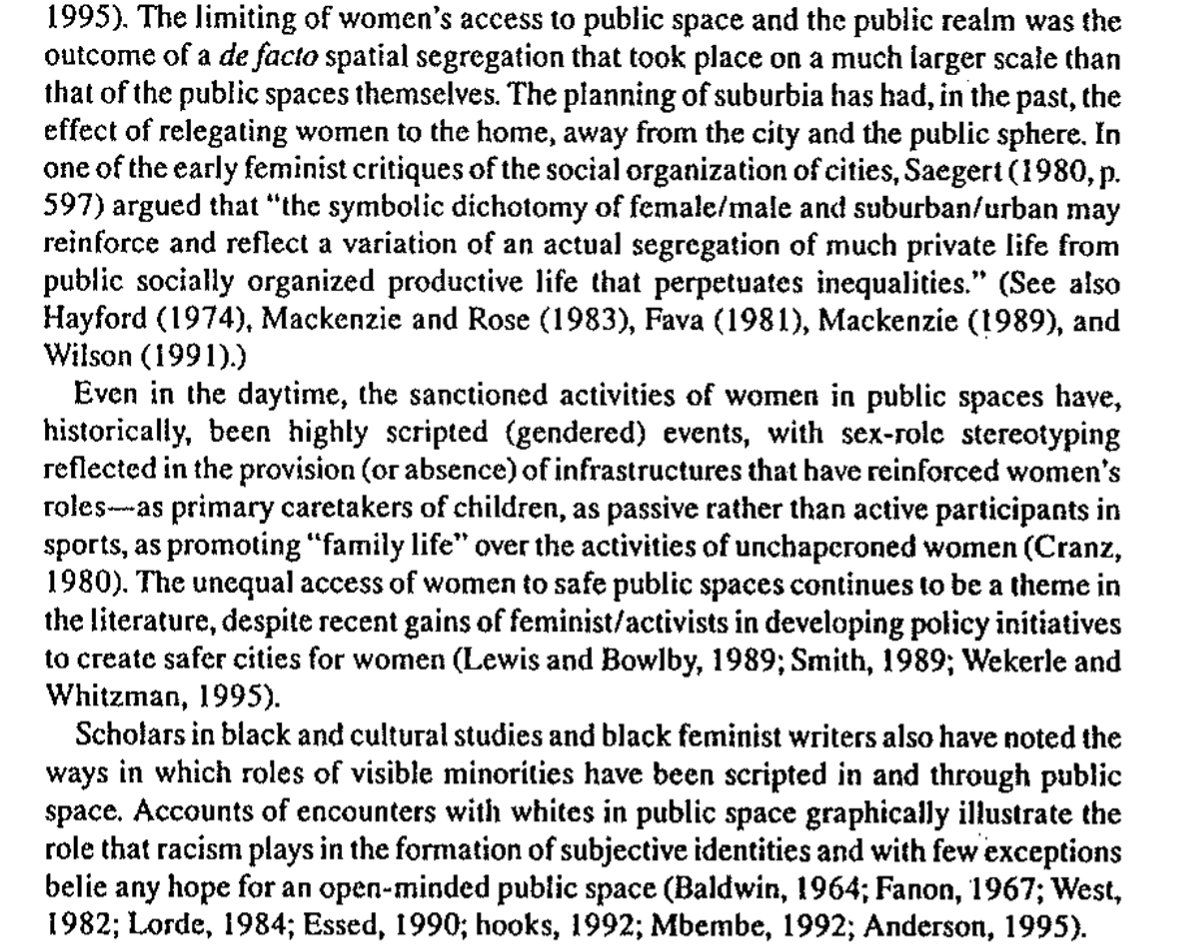 Susan Ruddick's "Constructing difference in public spaces: Race, class, and gender as interlocking systems". The article gives an impressive review of feminist, Black, antiracist, and anticolonial writers on these issues.