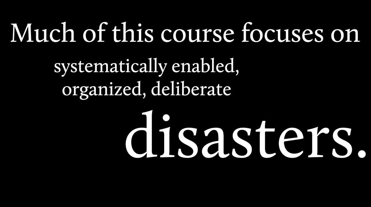The premise of the course is to examine deliberate but disastrous policies like airplane crash investigators. What do they reveal about the machinery of state that allowed them to happen? What methods do people have to avoid them in the future?