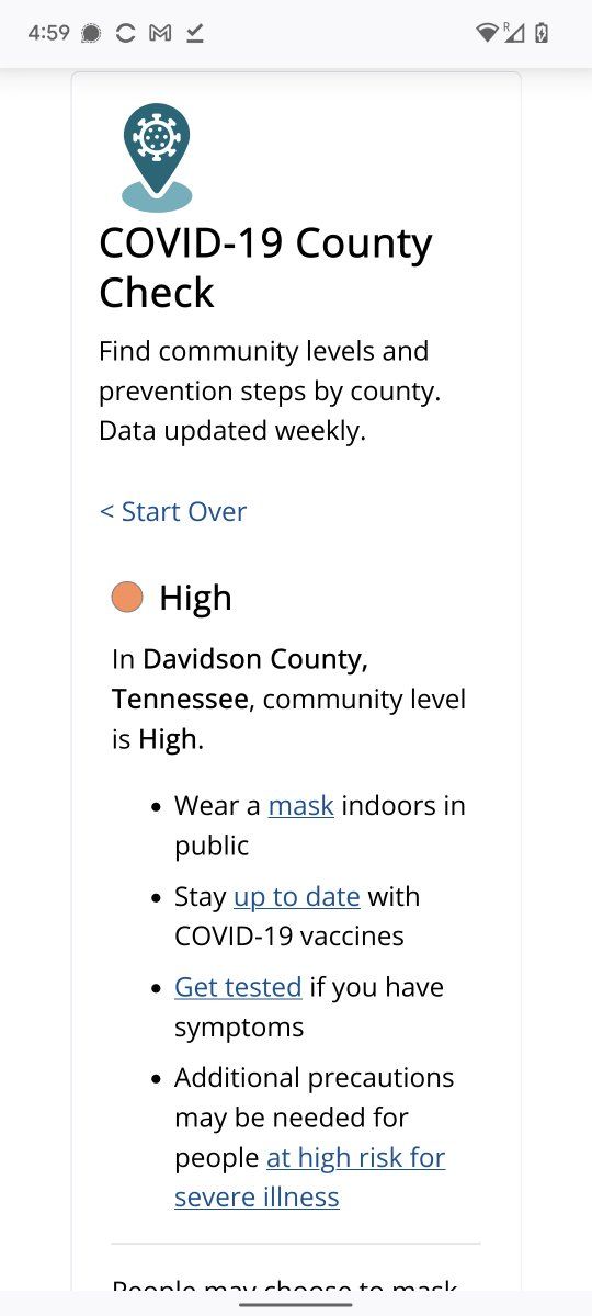 Current CDC guidance for Davidson County, as embedded on the Vanderbilt COVID page: