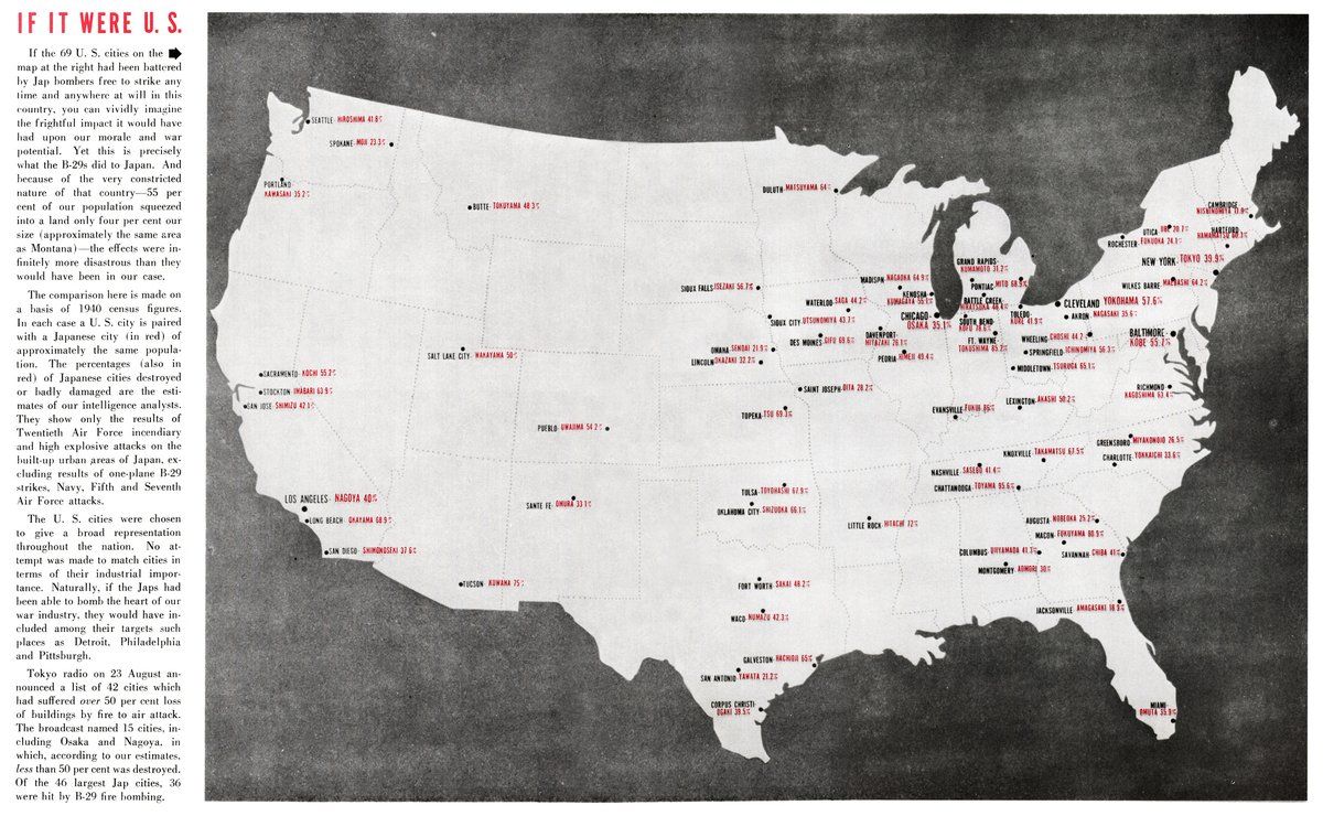 The striking percent-damage text has its origins in a 1945 issue of the Army Air Force magazine IMPACT. The story of these graphics is eloquently told by Alex Wellerstein @wellerstein here: blog.nuclearsecrecy.com/2014/03/12/firebombs-usa/