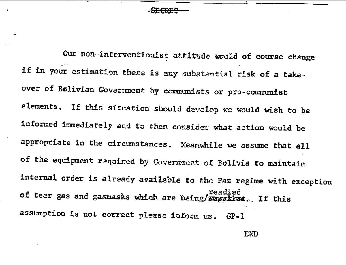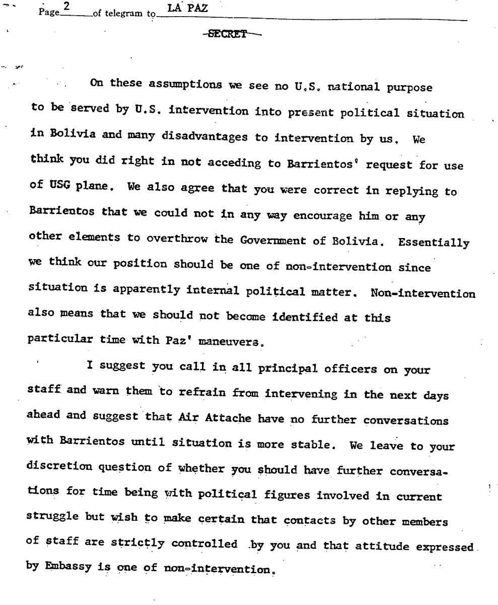 This cable orders the Embassy to get out of the way, and let the coup happen: "no U.S. national purpose is to be served by U.S. intervention into present political situation in Bolivia and many disadvantages to intervention by us."