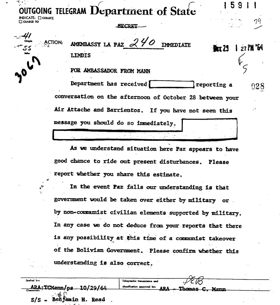 Per an October 29, 1964 cable: “Barrientos told [US} Air attache last evening that Armed Forces would depose [President Víctor] Paz [Estenssoro] within week. He wished to be absent from country so could return with clean hands as constitutional successor after Paz deposed.”
