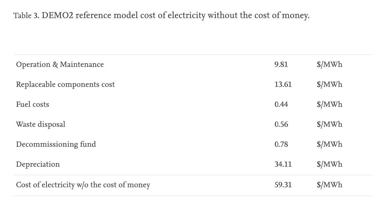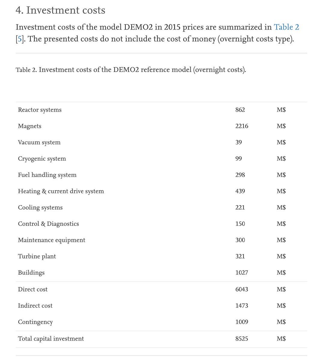 Under these scenarios we get a price tag of $8.5B for a 950MW DEMO2 power plant, in 2015 dollars. So basically, at the high-end of nuclear fission prices.