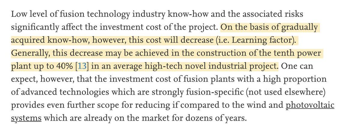 Fusion-boosting research articles like this one then assume that there will be an inherent cost reduction as multiple plants are built. The tenth plant will cost 40% less than DEMO, because technology is always getting cheaper, right? sciencedirect.com/science/article/pii/S0360544218305395