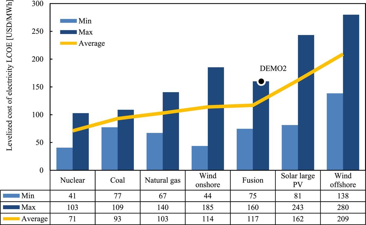In 2018, the article writers found a levelized cost of energy for fusion of $117 / MWh. Using mid-2010s costs of renewables, it was then competitive with wind and solar. But not any more…
