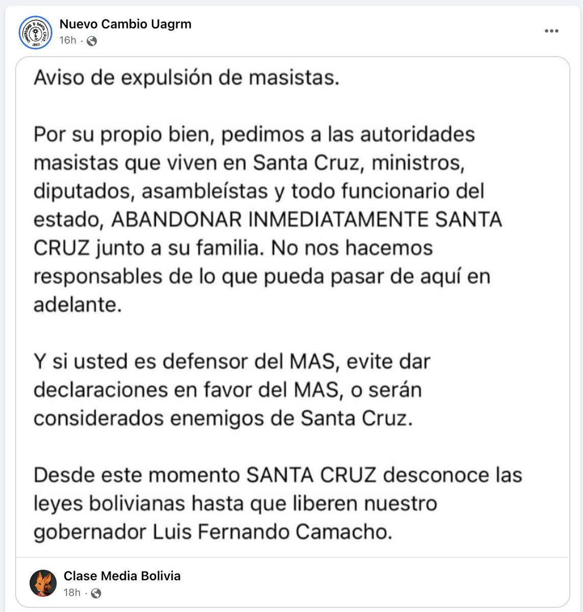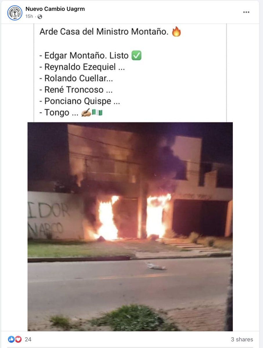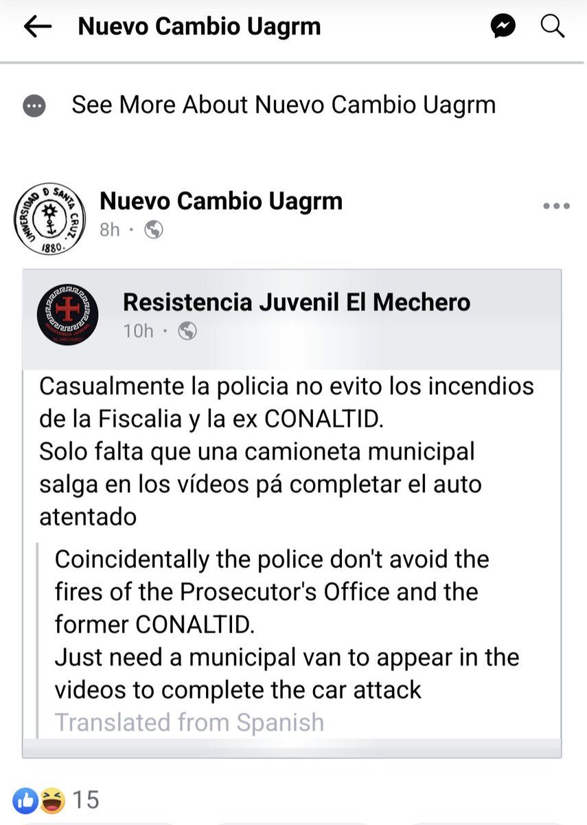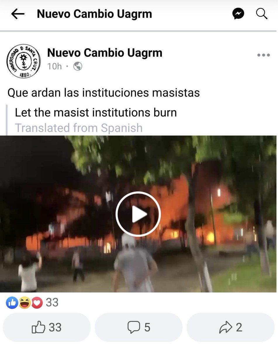 Consider Nuevo Cambio UAGRM's Facebook page, associated w/ the city's public university students. In the 9pm hour: "Let the MASista institutions burn." Two hours later: Police allowed the arson, this was a self-directed attack.