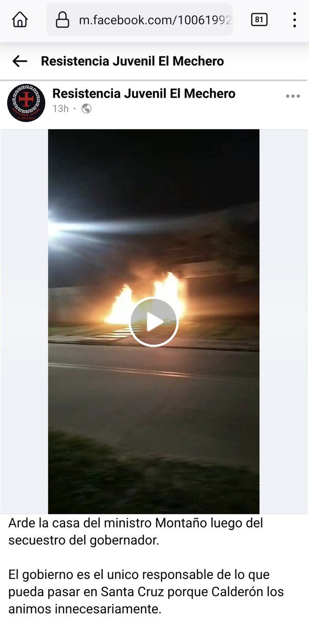 Resistencia Juvenil El Mechero, which circulated the "auto atentado" (orchestrated self-attack) theory, had just two hours earlier explained the arson as the result of "unnecessarily boiling the passions" of Cruceños by arresting Camacho. #SantaCruzEnEmergencia #Arson
