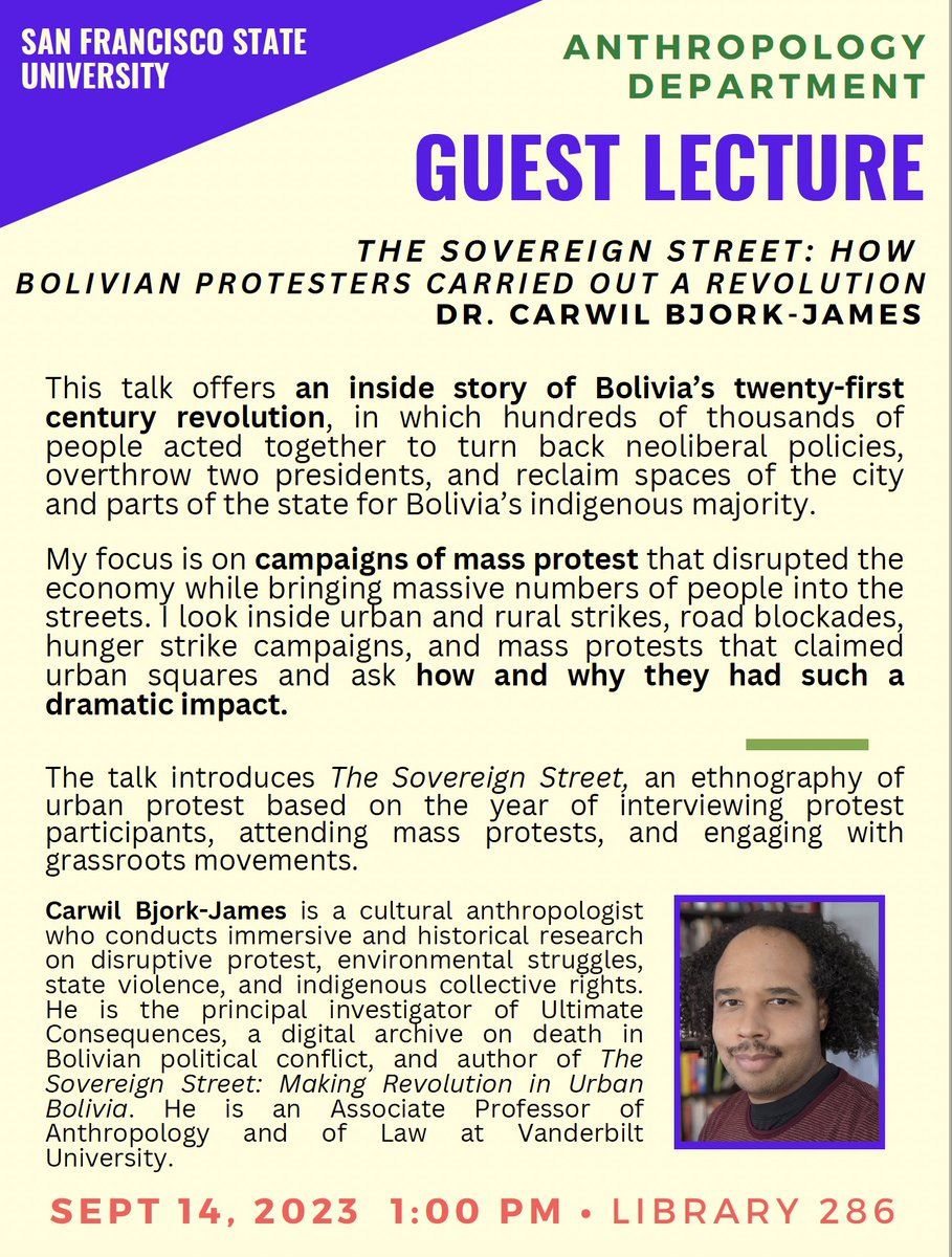 1. Come see me speak about The Sovereign Street: How Bolivian Protesters Carried Out a Revolution San Francisco State University Thurs Sep 14 at 1pm Library 286