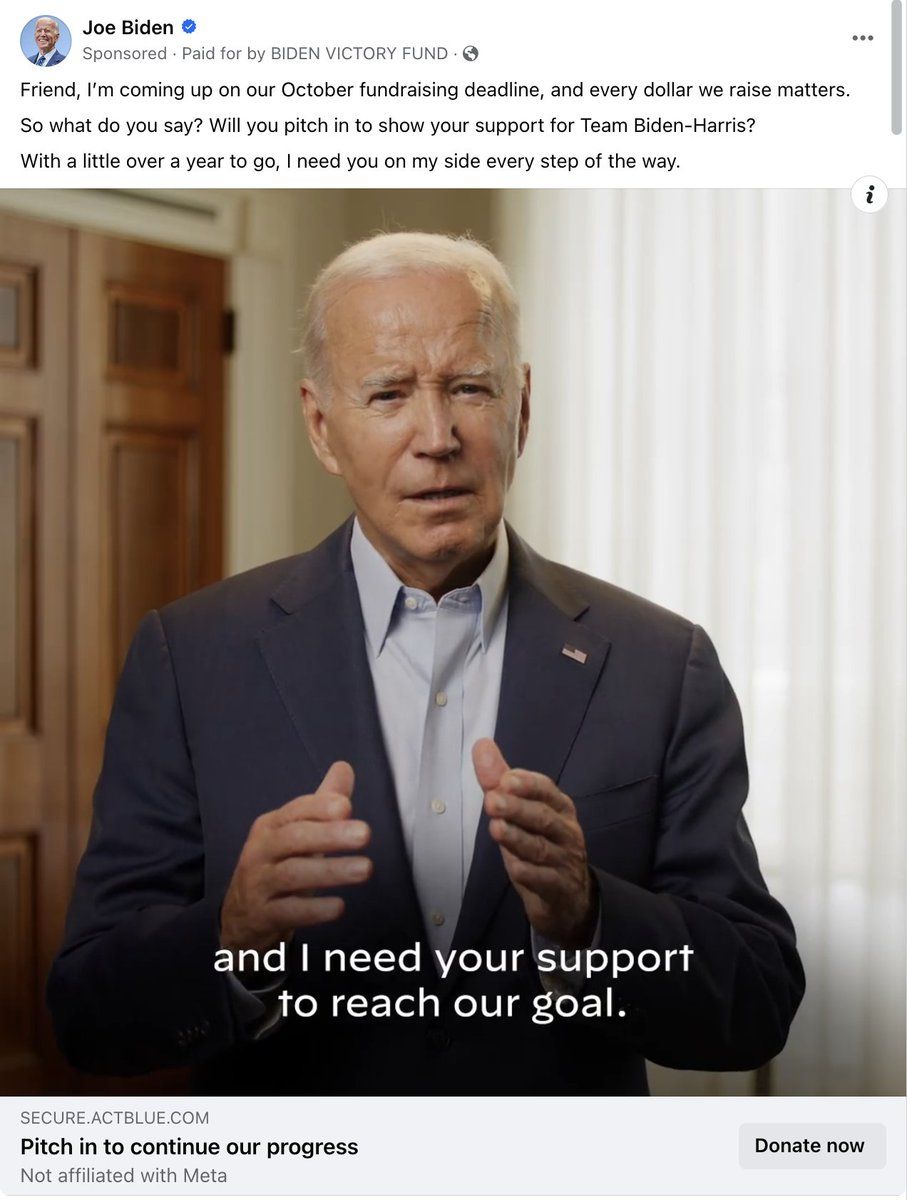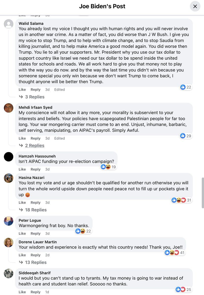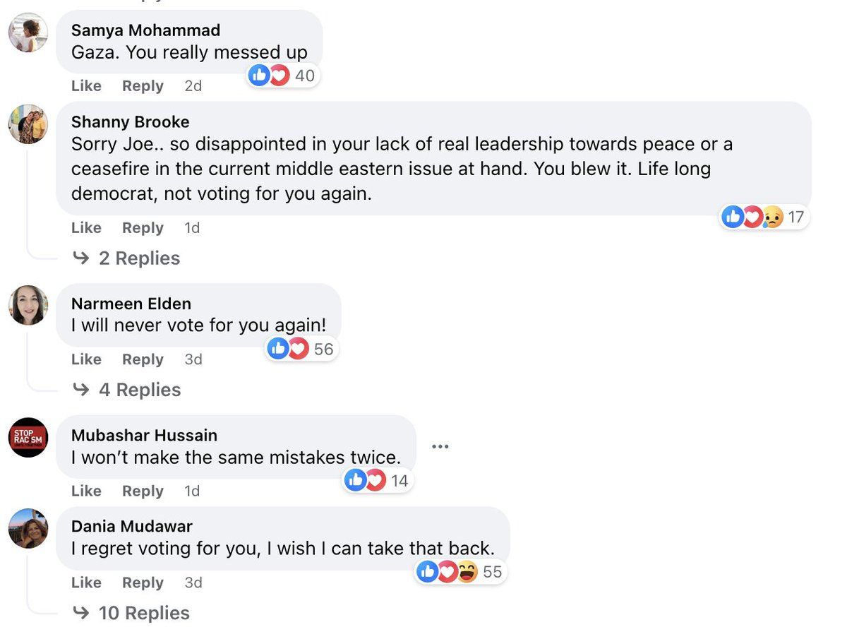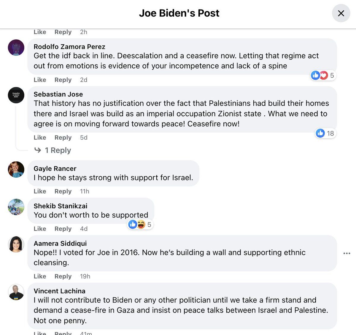 Biden fundraising pitch on Facebook met with dozens of refusing comments, mostly about Israel/Palestine.