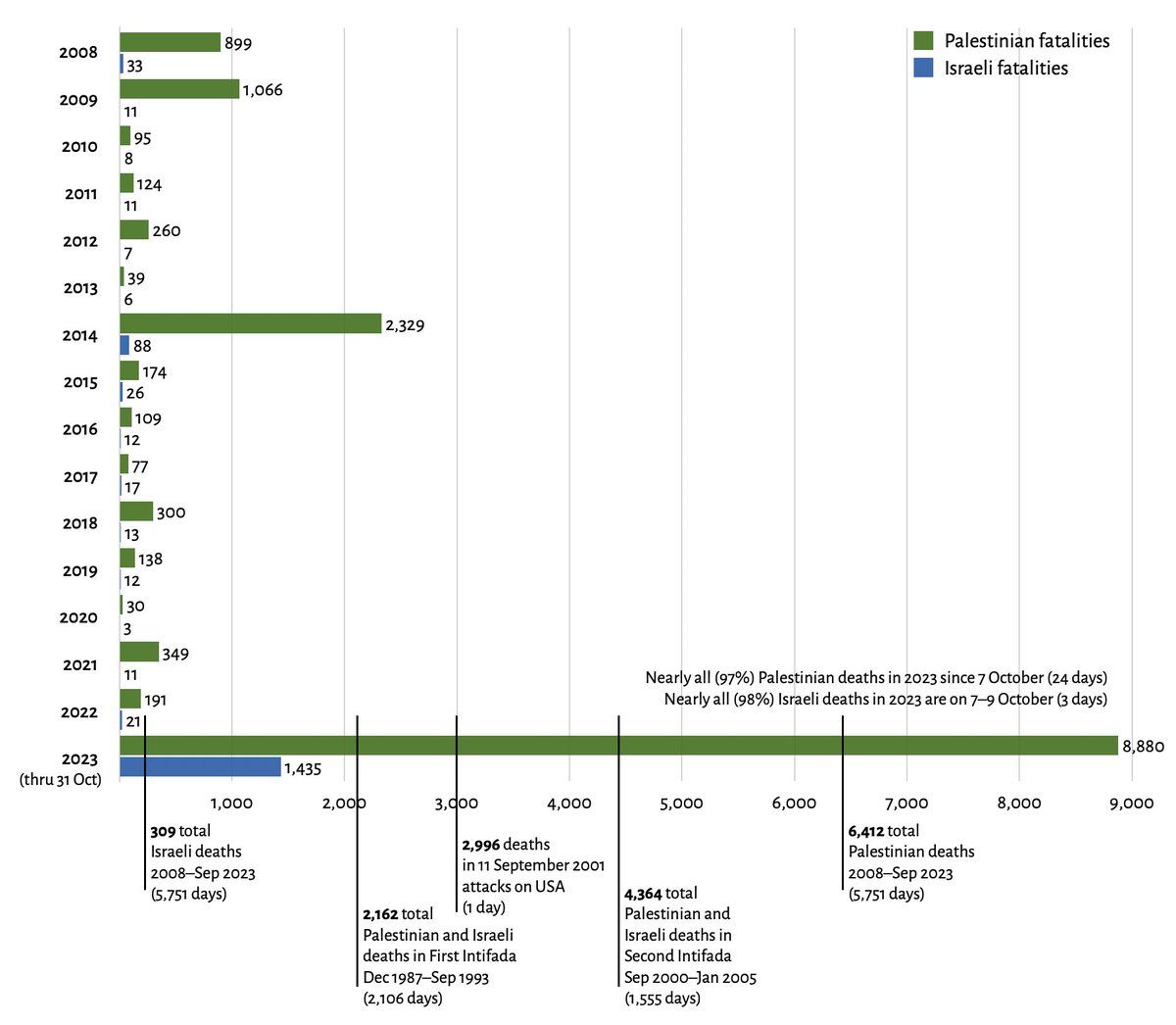 Deaths in October exceed all conflict deaths since 2008, or the two Intifadas combined, or two 9/11 attacks.