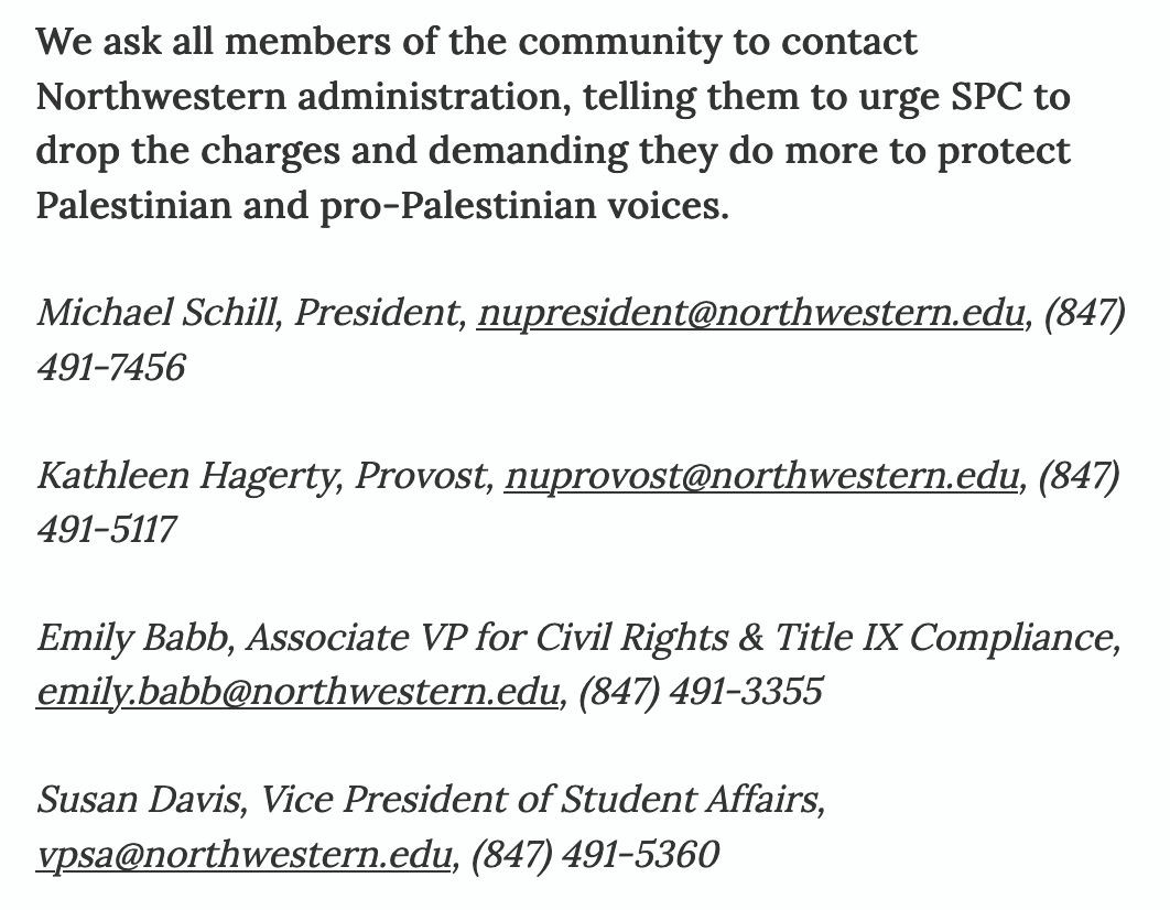 The charges are being pursued by the Northwestern University Police Department. Letter writers urge pressure to these officials. A petition to the university is here: chng.it/f9JMvG5Spk