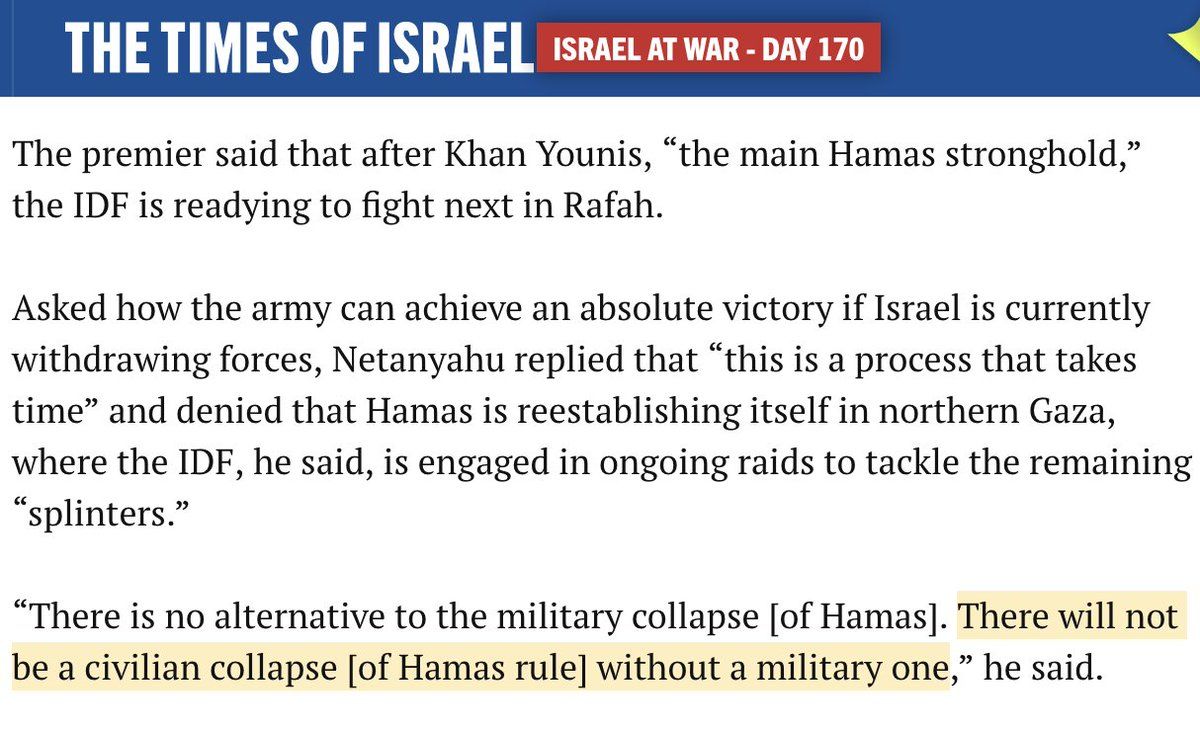 On February 7, PM Netanyahu explained the goal of the fighting goes beyond military defeat, to destruction of the civilian apparatus: "There is no alternative to the military collapse [of Hamas]. There will not be a civilian collapse [of Hamas rule] without a military one."