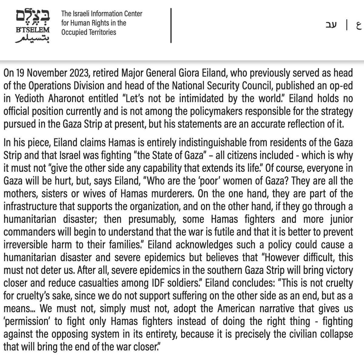 Per B'Tselem, "Eiland holds no official position currently and is not among the policymakers responsible for the strategy pursued in the Gaza Strip at present, but his statements are an accurate reflection of it." btselem.org/gaza_strip/20231207_humanitarian_catastrophe_as_policy