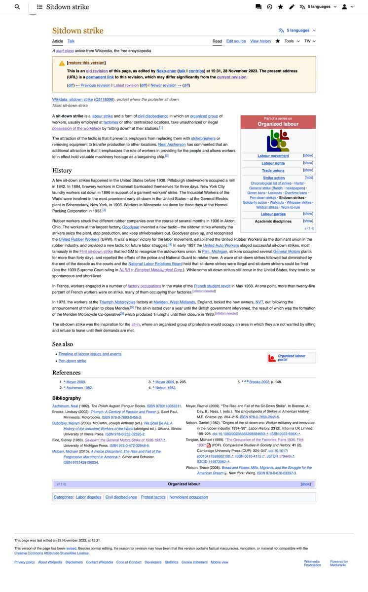 1. Proud to share this Wikipedia article on Sit-down strikes, which I rewrote and expanded as part of @WikiEducation's Scholars & Scientists program. en.wikipedia.org/wiki/Sitdown_strike