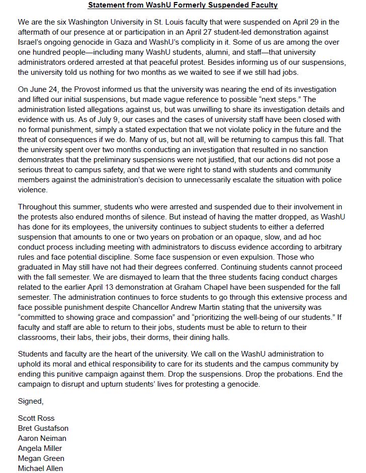 : A statement from formerly suspended WashU faculty (1/15)