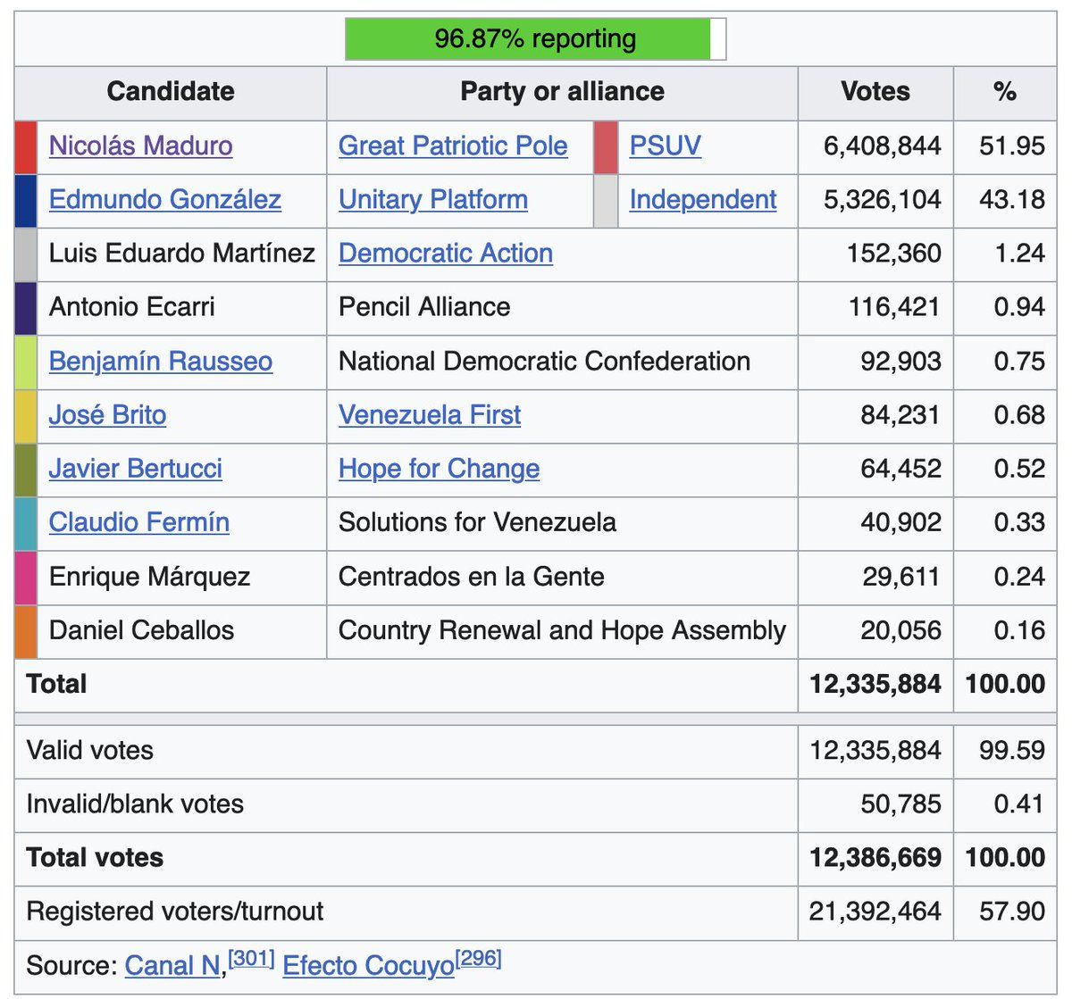 The comment by @LeonardoEFA that "the Venezuelan opposition is divided and they always have been" really doesn't accord with the election results posted by the CNE. Edmundo Gónzalez captured the vast majority of the opposition votes, fifty times his closest rival.