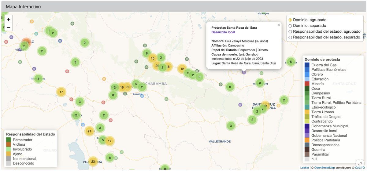 Comparto aquí una versión inicial de un mapa interactivo de muertes en conflictos politicos en Bolivia, 1982–2024. ultimateconsequences.github.io/vis/Map-Overview-Domains-es.html #UltimateConsequences #violenciapolitica #Bolivia #rstats #dataviz #leaflet