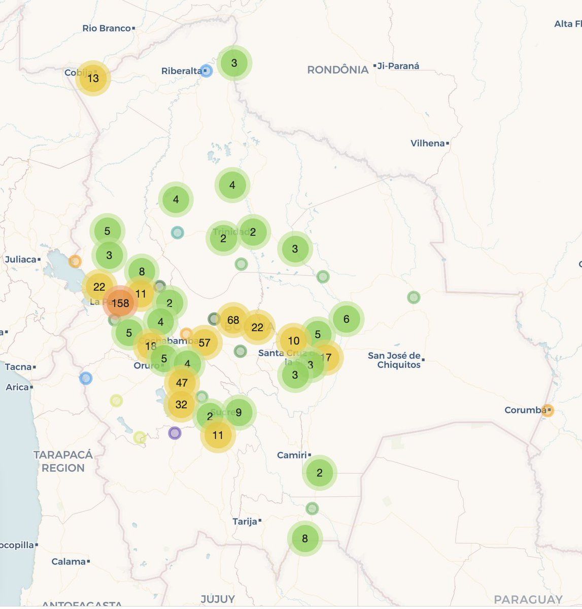 If you reduce the zoom, you'll see the entire country of Bolivia. The map shows 596 deaths. There are 75 deaths not included whose locations are not specified below the level of a municipality.
