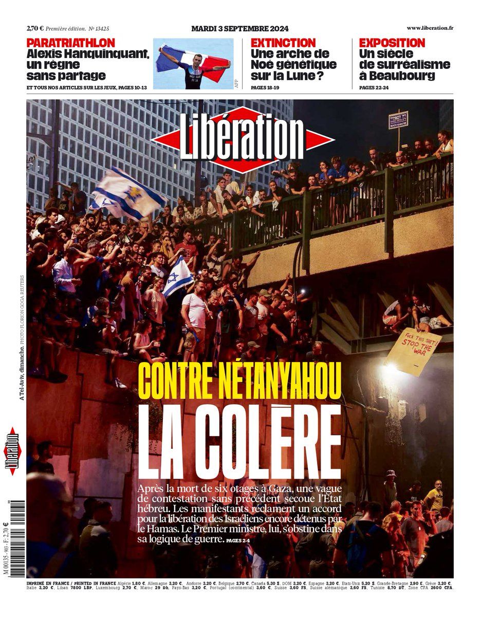 : Contre Nétanyahou : la colère. C'est la une de @libe ce mardi.