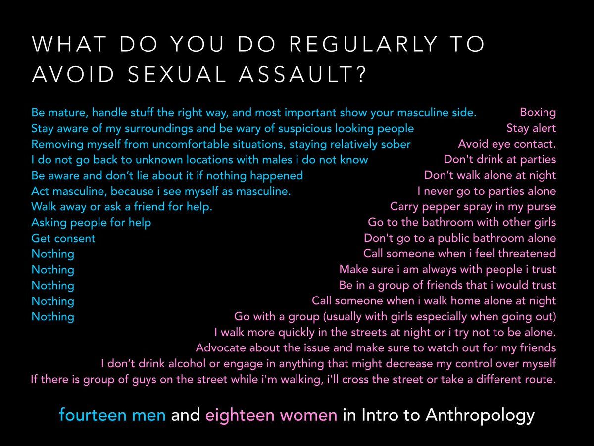 I asked fourteen men and eighteen women in an Intro to Anthropology class, "What do you do regularly to avoid sexual assault?" These were their answers: