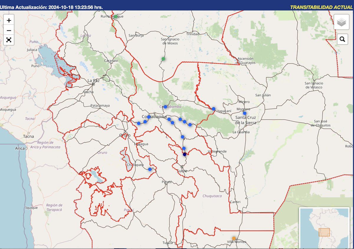 1. Road blockades in Bolivia by Evo Morales' faction have widened to 13 locations (blue points on map), now affecting Santa Cruz–Beni transport in addition to Cochabamba. Demands: Evo's presidential candidacy, end to his prosecution for statutory rape, repeal of economic decrees.
